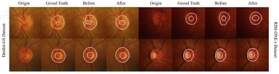 To intuitively assess the performance of the segmentation algorithm, this section presents a visual analysis of the segmentation results. As shown in Figure 3, the visualization is presented in a four-row layout. The top two rows display the segmentation results for the Drishti-GS dataset, while the bottom two rows focus on the RIM-ONE-r dataset. Each row follows a consistent four-column structure.