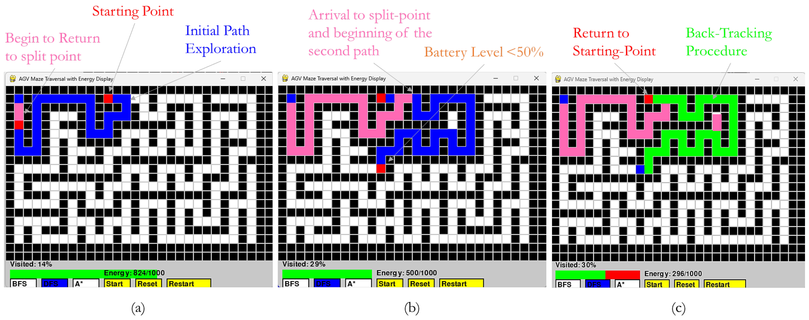 - The remaining battery energy is below the critical threshold of , initiating an emergency return to start (i.e., backtracking procedure).