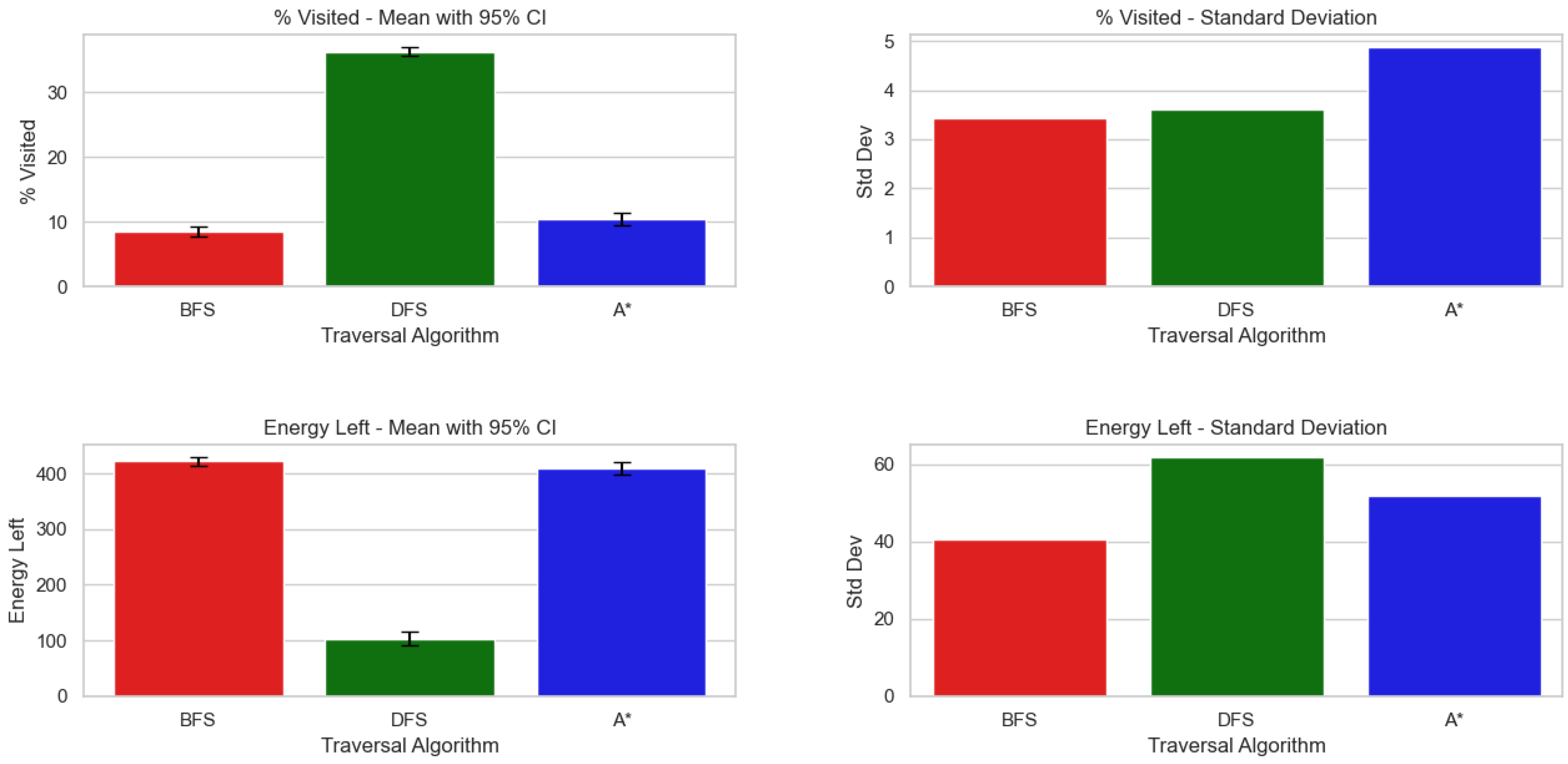 - Path Planning: This implements traversal algorithms (BFS, DFS, and ) to guide exploration, balance efficiency and energy use, and ensure robust backtracking when retreat is required due to environmental hazards or energy constraints.