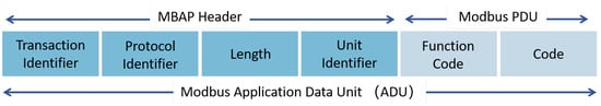 As shown in Figure 1, the Modbus TCP message structure consists of two main parts: the Modbus Application Protocol (MBAP) header and the Protocol Data Unit (PDU). Together, these constitute the Application Data Unit (ADU). The MBAP header is 7 bytes long and contains the following fields: (1) The Transaction Identifier used to match responses with requests and prevent message confusion during concurrent transactions. (2) The Protocol Identifier set to “0x0000” for Modbus TCP, identifying the protocol type. (3) The Length field specifies the length of the remaining bytes in the message, including the Unit Identifier, Function Code, and Data. (4) The Unit Identifier is used to address a specific remote server or a serially connected Modbus device in bridging scenarios. The PDU includes the following: (1) The Function Code indicates the type of operation requested by the client, and there are eight common types of function codes used for read and write operations on secondary device data. (2) The Data field contains the parameters associated with the function code, such as register addresses or values to be written.