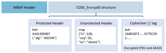 As shown in Figure 3, a secure Modbus packet consists of the original Modbus MBAP header and a COSE_Encrypt0 object that encapsulates the protected Modbus PDU. The COSE_Encrypt0 structure is a CBOR array containing three elements: