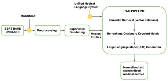The complete methodology integrates the supervised fine-tuning and RAG components through a systematically designed pipeline that manages the flow of medical entities from initial extraction to final normalization. The pipeline architecture ensures seamless transfer of identified entities from the fine-tuned transformer model to the RAG system, maintaining entity integrity and contextual information throughout the processing stages. This integration addresses the critical requirement of preserving entity relationships and clinical context while transforming raw medical terminology into standardized, interpretable descriptions. The entity flow management system begins with the output from the supervised fine-tuning stage, where identified medical entities are systematically organized and categorized according to their semantic types. Each entity retains its original textual context and positional information from the source clinical document, enabling the RAG pipeline to make informed normalization decisions based on both the entity itself and its surrounding clinical context. This contextual preservation is particularly important for disambiguating entities that may have different meanings depending on their clinical usage.