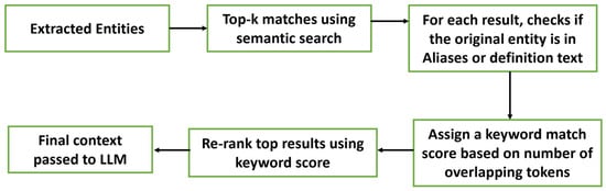 Re-ranking flow in the Dictionary-RAG framework. Extracted entities are first matched through semantic search, then refined with dictionary-based keyword scoring to improve alignment with clinical terminology before being passed to the LLM.