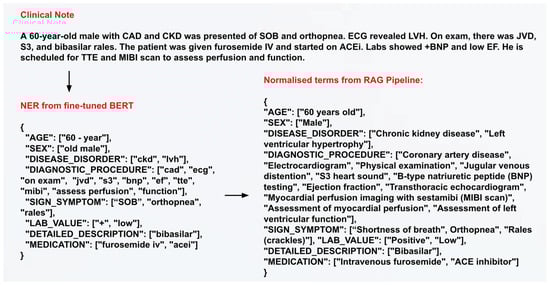 As shown in Figure 3, a clinical note containing several abbreviations and vague medical terms—such as “SOB”, “CKD”, “TTE”, and “MIBI”—is first processed through our fine-tuned BERT model trained on the MACCROBAT dataset. This model segments the note into structured entity categories (e.g., AGE, SEX, SYMPTOMS, DISEASE DISORDER, DIAGNOSTIC PROCEDURE), but the extracted entities often retain ambiguous or shorthand terms from the original text. To address this, the NER output is passed into our Dictionary-Infused RAG pipeline. Specifically, only potentially ambiguous terms are embedded using BioBERT and queried against a Pinecone vector database populated with UMLS-derived concepts. The retrieved results are re-ranked based on keyword overlap with the original term, and the top matches are used to construct a targeted prompt for Gemini. The LLM is then instructed to normalize the input entity using only the retrieved context, ensuring that vague or abbreviated terms are enhanced while unambiguous entries remain unchanged. This selective correction mechanism preserves the structural integrity of the original NER categories while improving their clarity. For instance, “SOB” becomes “Shortness of breath”, “TTE” is expanded to “Transthoracic echocardiogram”, and “Furosemide IV” is reformatted as “Intravenous furosemide”. This transformation leads to a final output that is more interpretable, medically precise, and suitable for downstream clinical applications.