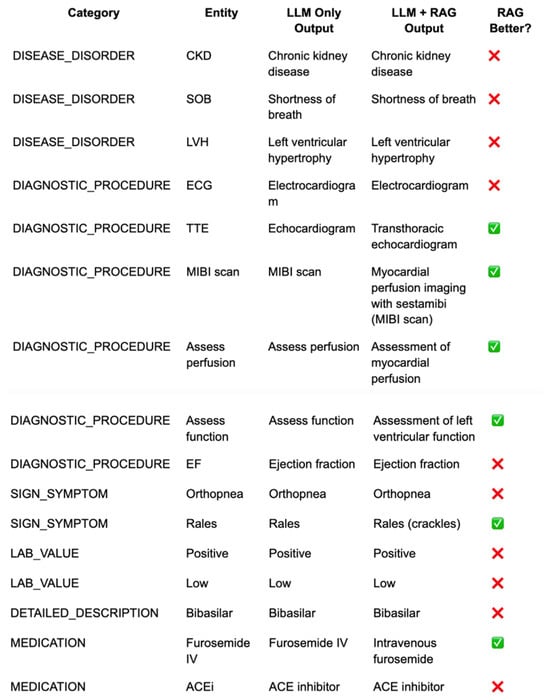 To understand the impact of our RAG pipeline, we evaluated its ability to clarify ambiguous entities produced by the NER model. Figure 4 shows a sample of entities across different categories, comparing outputs generated by the LLM alone versus the same LLM with RAG enhancement. In the table, a check mark indicates that RAG improved the output, while a cross (✗) indicates no improvement.