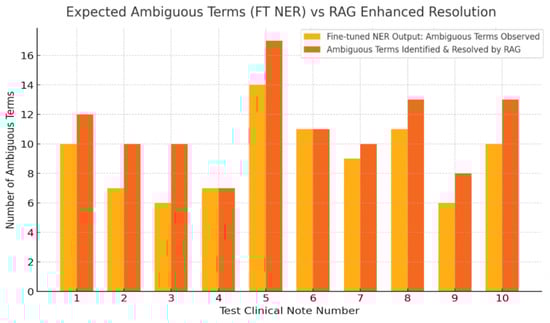 Evaluation of RAG enhancement on ambiguous entities extracted from fine-tuned BERT outputs across 10 clinical notes, showing improved resolution of abbreviations and overlooked terminology.