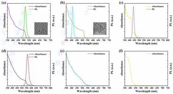 Optical characterization of inorganic cesium lead halide perovskite NCs with varying halide compositions and Bi doping. (a) Absorption and PL spectra of CsPbBr3 NCs; inset: TEM image showing uniform cubic morphology. (b) Absorption and PL spectra of CsPbCl3 NCs; inset: TEM image showing well-dispersed NCs. (c) Absorption and PL spectra of CsPbBrxCl3−x NCs synthesized via halide exchange. (d) Absorption and PL spectra of CsPbBrxI3−x) NCs synthesized via halide exchange. (e) Absorption and PL spectra of Bi-doped CsPbBr3 NCs, showing complete PL quenching. (f) Absorption and PL spectra of Bi-doped CsPbCl3 NCs, also exhibiting complete PL quenching.