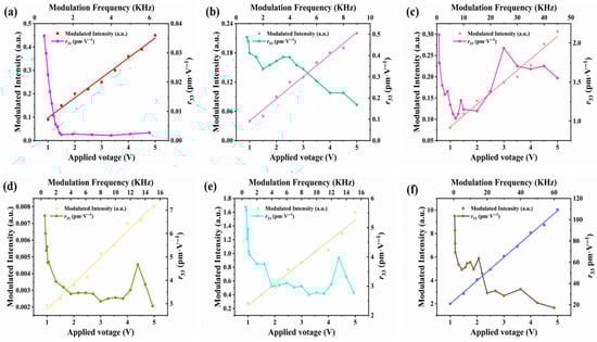 The linear EO properties of electrophoretically deposited perovskite NC films were characterized by measuring the modulation strength under a fixed modulation frequency of 1 kHz, where all samples exhibited a linear increase in signal amplitude with applied voltage, confirming the linear EO effect, as shown in Figure 2.