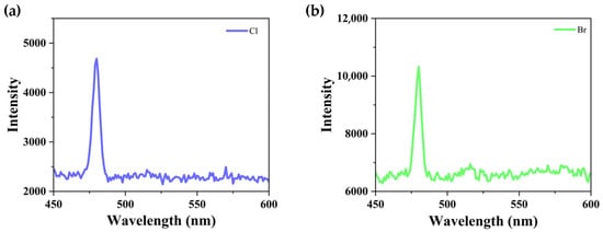 Mixed-halide compositions, including CsPbBrxCl3−x and CsPbBrxI3−x, were synthesized via a post-synthetic anion exchange strategy []. This was carried out by directly mixing two types of pre-formed NCs (e.g., CsPbCl3 with CsPbBr3 for CsPbBrxCl3−x, or CsPbBr3 with CsPbI3 for CsPbBrxI3−x) in nonpolar solvents under ambient conditions (e.g., toluene). Anion exchange occurred spontaneously within minutes, resulting in alloyed, single-phase perovskite NCs rather than a physical mixture of two distinct compositions. This ensured structural homogeneity and avoided dual emission that would otherwise indicate incomplete exchange. By adjusting the ratio of the two parent NCs, the emission peak of the mixed-halide NCs could be finely tuned between those of the pure-halide endpoints [,]. Importantly, no dual-emission behavior was observed, confirming uniform halide redistribution across the NC ensemble. The resulting spectra exhibited narrow emission linewidths and maintained high photoluminescence quantum yields, consistent with previously reported halide-exchanged CsPbX3 NCs [].