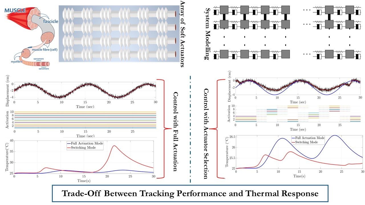 To clarify the differences between our approach and existing studies, we compare our work with that of Ebrahimi et al. [2], which also investigates actuator selection for trajectory tracking. Their framework relies on offline actuator selection, assumes that all system states are directly measurable, and does not consider thermal effects. By contrast, our framework implements a real-time actuator selection strategy with explicit switching between sets of activated actuators and soft switching, where an overlap is introduced between consecutive sets during transitions. We perform trajectory tracking using a methodology that is robust against process and measurement noise, and we incorporate thermal profile analysis to balance tracking performance with thermal management. These extensions make the proposed framework more representative of practical soft artificial muscle systems.