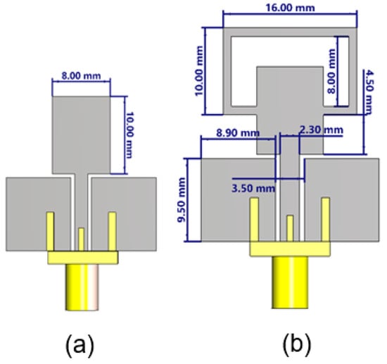 Evolution of the single antenna element design intended for MIMO applications, printed on a 1.6 mm thick FR4 substrate (εr = 4.3). (a) Initial monopole design with a simple rectangular radiator. (b) Modified design incorporating a rectangular parasitic rectangle.