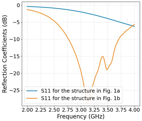 Comparison of the simulated reflection coefficients (S11) for the antenna structures in Figure 1a,b.