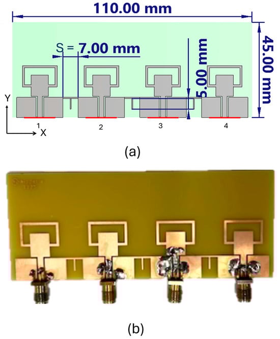 The illustrated MIMO antenna structure in Figure 3 is designed using the evolved single-element structure previously discussed in Figure 1b. The array is printed on a 45.00 mm × 110.00 mm rectangular FR4 substrate with a thickness of 1.6 mm and a relative permittivity of 4.3. Each antenna element features a rectangular parasitic ring surrounding a central monopole fed via a coplanar waveguide (CPW) configuration, with the ground and feedline printed on the same side of the substrate.