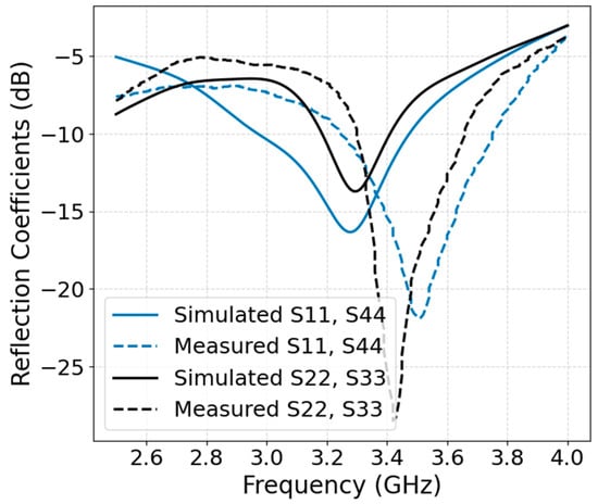 Figure 4 illustrates the measured and simulated reflection coefficients (S11, S44, S22, and S33) of the proposed MIMO antenna across the 2.5–4.0 GHz frequency range. The results highlight the symmetrical nature of the antenna design, as evidenced by the close agreement between S11 and S44, as well as between S22 and S33. This symmetry confirms that the antenna elements are identically designed and equally spaced, ensuring consistent input matching performance across ports. The measured reflection coefficients for both S11/S44 and S22/S33 achieve deep notches around 3.4 GHz, with minimum values reaching below −25 dB and −30 dB, respectively. These values indicate excellent impedance matching. The measured −10 dB impedance bandwidth spans from approximately 3.3 GHz to 3.65 GHz, providing a 350 MHz bandwidth, which is well-suited for sub-6 GHz 5G applications, respectively.