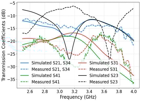 Figure 5 presents the simulated and measured transmission coefficients of the proposed four-port MIMO antenna, highlighting the mutual coupling behavior between different antenna elements. The results confirm that the antenna achieves strong isolation, particularly around the center frequency of 3.4 GHz. Most transmission coefficients—including S21, S34, S31, and S41—maintain values below −10 dB from approximately 3.3 to 3.6 GHz, which meets the isolation requirements for effective MIMO performance. The S23 parameter exhibits the highest isolation, with similar values reaching below −35 dB and measured values around −25 dB, centered at 3.4 GHz. However, at 3.2 GHz, S23 remains above −10 dB, indicating that optimal decoupling occurs specifically around 3.4 GHz. These results validate the antenna’s capability to minimize mutual coupling within the intended operational band, supporting its suitability for sub-6 GHz MIMO applications.