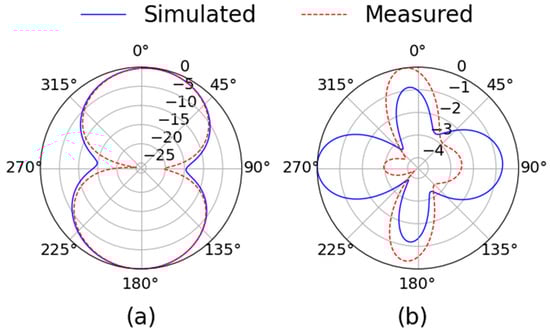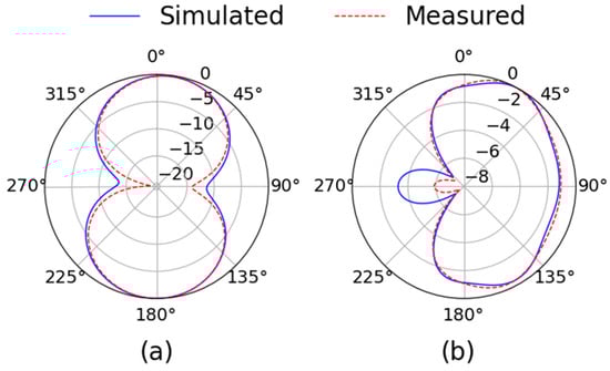 Port 2, presented in Figure 7, exhibits similar characteristics. The XZ-plane radiation pattern (Figure 7a) maintains the bidirectional nature observed in Port 1, with symmetrical main lobes and low side lobe levels. In the YZ-plane (Figure 7b), the radiation pattern becomes more complex, showing multiple lobes. Despite this complexity, the measured and simulated patterns are in good agreement, underscoring the design’s repeatability and robustness.