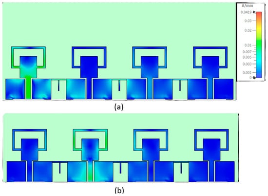 Figure 8 reports surface current density in A/m. When the array uses the T-shaped decoupling (Figure 8a, Port 1 excited), the peak current on the driven element is ~0.03–0.04 A/m, while the coupled current on the nearest adjacent element remains below ~0.007–0.010 A/m. This corresponds to a coupled/driven current ratio of 0.18–0.33 (≈9–15 dB lower). In the baseline without decoupling (Figure 8b, Port 2 excited), adjacent element peaks rise to ~0.015–0.020 A/m for a ratio of 0.38–0.55 (≈5–8 dB lower).