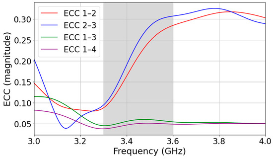 Figure 9 presents the ECC performance of the proposed antenna across a frequency range of 3.0 to 4.0 GHz, with a focus on the operating band between 3.3 and 3.6 GHz (highlighted in gray). The ECC values for all antenna element pairs (1–2, 2–3, 1–3, and 1–4) remain well below 0.5 within the operating band, indicating strong MIMO performance. The highest observed ECC values are for pairs 1–2 and 2–3, peaking around 0.3, while pairs 1–3 and 1–4 consistently exhibit values below 0.05, reflecting excellent isolation and pattern diversity.