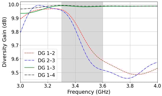 Figure 10 illustrates the Diversity Gain (DG) across a frequency range of 3.0 to 4.0 GHz for different antenna element pairs (1–2, 2–3, 1–3, and 1–4). The target operating band (3.3–3.7 GHz) is shaded in gray. Within this band, the diversity gain for most antenna pairs remains close to the ideal value of 10 dB, particularly for pairs 1–3 and 1–4, which show minimal variation and stay nearly flat, reflecting excellent performance. In contrast, DG values for pairs 1–2 and 2–3 exhibit a slight dip within the band, decreasing to around 9.5 dB, which is still considered acceptable for practical MIMO systems.