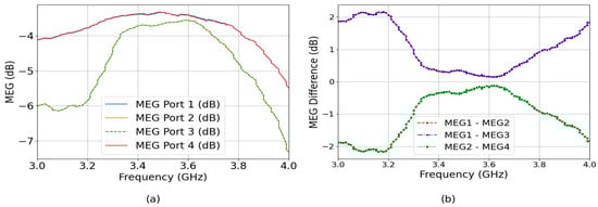 Figure 11b presents the MEG differences between ports, which assess power imbalance among antenna elements. For optimal performance, MEG differences between any two ports should be less than 3 dB. The curves for MEG1–MEG2, MEG1–MEG3, and MEG2–MEG4 mostly stay within ±2 dB across the band, which confirms that the antenna ports exhibit balanced power reception and maintain good multipath efficiency.