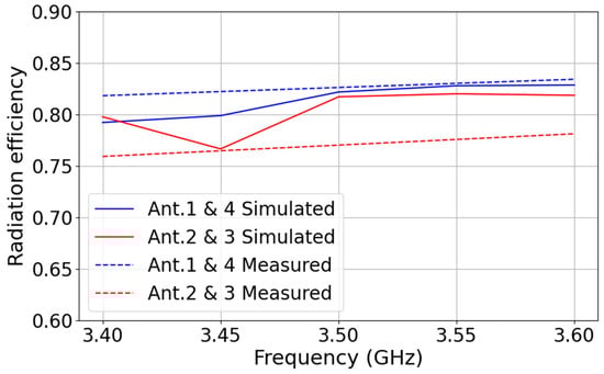 In the operating bandwidth of 3.4–3.6 GHz, the radiation efficiency of the 4-element MIMO antenna remains high, with values between approximately 78% and 84% for both simulated and measured results, as shown in Figure 12. This indicates that the antenna operates with minimal loss, ensuring that most of the input power is effectively radiated. The strong agreement between measured and simulated efficiencies further validates the accuracy of the design and confirms that fabrication and measurement variations have only a small impact on performance. Such consistently high efficiency across the band demonstrates the antenna’s reliability and suitability for sub-6 GHz MIMO applications.