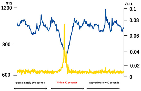 An example of extracted RR interval time series and physical activity time series for a transient activity episode (<60 s) obtained from a single participant (not group average). The blue line represents RR interval (RR, ms), and the yellow line represents physical activity [movement intensity score, arbitrary unit (a.u.)]. The activity level was derived from 3-axis accelerometer signals and normalized to a 0–0.1 scale (a.u.) rather than shown in physical units of gravitational acceleration (g) in order to standardize across participants and facilitate comparison with RR interval dynamics. The accelerometer signal [original unit g, range ±1 g] was band-pass filtered between 0.1 and 1.2 Hz (hertz) to remove direct current (DC) and high-frequency components. The square root of the sum of squares was computed to convert the tri-axial data into a univariate activity index. The x-axis shows a continuous ~60 s segment that included posture transitions (supine → upright → supine). A model equation was developed using X as the RR interval and Y as the physical activity level, and the response of X to changes in Y was calculated. (Abbreviations: RR = R–R interval (beat-to-beat interval, ms = millisecond, a.u. = arbitrary unit, g = gravitational acceleration unit (9.81 m/s2), Hz = hertz, DC = direct current)
