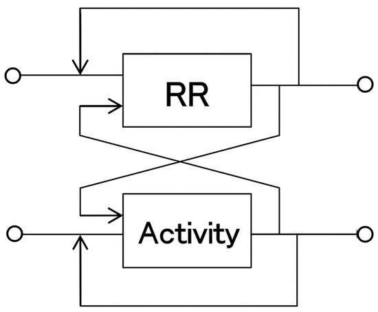 Multivariate Autoregressive Model (MVAR) was applied to each episode to predict HR responses to transient physical activity. MVAR model is a statistical model used to analyze how multiple time series data influence each other and change over time. It is an extension of the basic autoregressive (AR) model to handle multiple variables. AR model assumes that the future value of a variable can be explained by its own past values (Figure 2). In contrast, the MVAR model handles multiple different time series data simultaneously. Therefore, MVAR models assume that the current value of each variable is determined not only by its own past values but also by the past values of all other variables, and express this relationship in mathematical terms for analysis and prediction. The MVAR model considers a case where there are two time series data, Xt and Yt. It assumes that the current value of Xt is influenced not only by Xt−1 (the value of X one period ago) but also by Yt−1 (the value of Y one period ago). Similarly, the current value of Yt is considered to be influenced not only by Yt−1 but also by Xt−1. These influences are expressed as linear relationships, and by estimating the coefficients (weights) indicating the degree of influence between each variable, the specific relationships are clarified (linear combination).