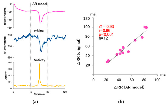 Twelve healthy adult males (age: 41 ± 9 years) participated in this pilot study. Considering the small sample size, only male participants were recruited to minimize potential sex-related variability in autonomic responses. This limitation is acknowledged in Section 4. All participants provided written informed consent prior to participation. The study protocol was approved by the Ethics Committee of Nagoya City University Hospital (Approval number: 60-18-2011, 22 March 2019). Cardiac activity was recorded using an ultra-compact wireless Holter-type electrocardiograph equipped with a built-in three-axis accelerometer (Cardy 303 pico, Suzuken Co., Ltd., Nagoya, Japan). The device was attached to the anterior chest with a standard modified lead II configuration: three disposable pre-gelled electrodes (Kenz P 303, Suzuken Co., Ltd., Nagoya, Japan) were placed at the right infraclavicular area, the left lower chest, and the right lower chest (ground). The skin was cleaned with an alcohol swab prior to electrode placement. The integrated accelerometer was thus positioned on the anterior chest, enabling reliable capture of trunk posture while minimizing motion artifacts. Each subject underwent two 24 h free-living recording sessions separated by a one-week interval. Participants kept daily logs of sleep and wake times, which were cross-validated with accelerometer signals for classification of awake and sleep periods. Two types of transient body activities were analyzed: (A) Awake condition: Approximately 40 short, spontaneous episodes of physical activity (≤60 s each) were identified during wakefulness. (B) Sleep condition: Approximately 10 episodes of movement arousals (≤60 s each) were identified during sleep. Transient activity episodes were defined in accordance with previously published accelerometer paper [41], as short increases in activity level above a threshold of 0.2 arbitrary units lasting less than 60 s, with a minimum duration of 10 s. The number of episodes varied across individuals, and the reported counts represent approximate averages.