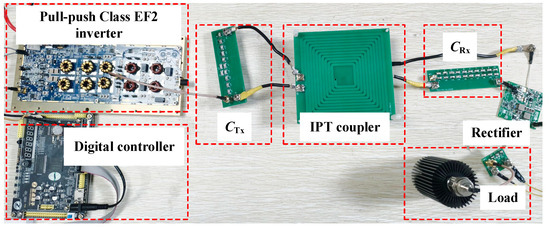 - Huang, X.; Yu, Z.; Dou, Y.; Lin, S.; Ouyang, Z.; Andersen, M.A. Load-independent push–pull Class E2 topology with coupled inductors for MHz-WPT applications. IEEE Trans. Power Electron. 2022, 37, 8726–8737. [Google Scholar] [CrossRef]