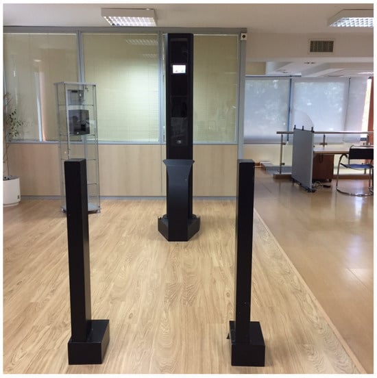 Despite the technical difficulties, several commercially available systems for IAAD exist. Among them, the Spanish SHS Consultores SL provides one solution. The AIRIM system (http://www.slideshare.net/SHSConsultores/datasheet-airim, accessed on 4 July 2025) can capture irises from a moving person situated at a distance from the camera. In AIRIM, the position of the sensor is fixed, and the people are required to walk through a ‘virtual’ corridor and look directly at the camera (see Figure 1). The system requires a moderate level of cooperation: looking forward, walking at a normal pace, and obviously not engaging in a behaviour intended to prevent the iris image capture. The recognition distance is 1.7 m and the system uses near infrared illuminators (NIR) at 940 nm, taking advantage of the sensibility of the deployed cameras.