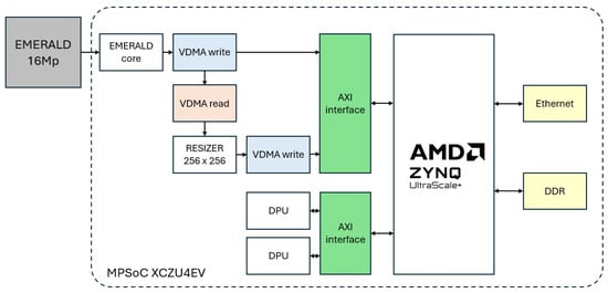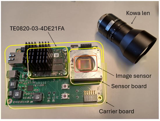The aim of the design is to make the captured image quickly accessible for further processing. The vision sensor delivers the image using 16 LVDS (low-voltage differential signaling) channels, with the frame grabber synthesised into the programmable logic (FPGA) of the MPSoC. This makes further image processing in the MPSoC highly efficient: no central processing unit or bus is required, and the processing can start immediately after reading the first pixel rows of the image. In a GPU-based solution, for instance, it is necessary to establish a communication channel with the frame grabber to minimise latency []. The device is built around a commercially available AMD/Xilinx Ultrascale+™ ZU4EV module, mounted on the TE0820-03-4DE21FA micromodule by Trenz (Hüllhorst, Germany) (https://shop.trenz-electronic.de/en/Products/Trenz-Electronic/TE08XX-Zynq-UltraScale/, accessed on 17 September 2025). Table 1 summarises the relevant features of this device.