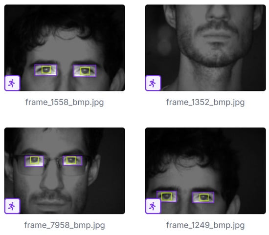 As mentioned above, the system tries to solve two problems: (i) the detection of iris areas in the input images and (ii) the iris segmentation. Each problem is solved with a specific neural network, which requires a dataset for training. For the first problem, although there are databases with images of people at a distance from the camera, showing full faces with irises of sufficient quality (approximately 200 pixels/cm) (e.g., the CASIA-Iris Distance V4 dataset), we did not have a database with images of passing sequences, capturing images of people approaching the pole, with all the problems of motion, total or partial occlusions, reflections, etc. In order to train our model with data as close to the reality of the problem as possible, a dataset comprising 7071 images has been captured. Figure 3 shows some frames extracted from one of the sequences included on the dataset. Roboflow (https://roboflow.com/annotate (accessed on 15 September 2025)) was used to label images. Two classes have been labelled: eye and iris/pupil. Examples of labelling can be seen in the figure. In principle, only the iris/pupil class could have been labelled. However, having both classes allows for robust detection of the latter: an iris/pupil region will only be valid if it is within an eye region. This simple rule has allowed the system to discard false positives without missing any true positives. When you have labelled the eyes and irises/pupils present in the frames, it is important not to label those that are clearly out of focus. In our case, and contrary to what happens for example with the CASIA-Iris Distance V4 database, not all eyes in the image will be in focus. As long as the face of the person is located in the range of distances from the sensor that delimit the depth of field, the eyes are correctly in focus. Many of them will have the required quality to address iris recognition identification. When the face is outside this range, the eyes are out of focus and they should not be detected.