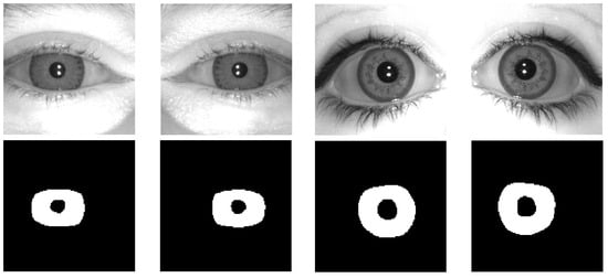 On the other hand, a second dataset is needed to train the network used to segment the iris. In this case, the inputs can be focused eyes, and there are numerous publicly available databases. In particular, CASIA-Iris-V3-Interval (CASIA-IrisV3, http://www.cbsr.ia.ac.cn/IrisDatabase (accessed on 4 July 2025)) and IIT Delhi 1.0 [] have been used. The ground truth for iris segmentation is available for both in the IRISSEG-CC (Halmstad University) and IRISSEG-EP (University of Salzburg) databases [,], respectively. To these datasets, we have added a set of 263 images captured by our system, whose ground truths have been manually generated. Among these, 79 images were acquired with contact lenses designed to conceal the iris, in order to ensure proper segmentation under this type of attack so that it can be effectively detected by the system in subsequent processing stages (see Figure 4 for representative examples of these images and their corresponding segmentations). After splitting, 1849 images from the CASIA dataset and 1568 images from the IITD dataset were used to train the segmenter. The aforementioned small set of 263 images captured with our system was also used for training. Validation employs 263 and 224 images from the CASIA and IITD datasets, respectively. The CASIA test set consists of 527 images while the IITD test set consists of 448 images.