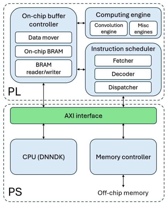 Briefly, the DPU consists internally of a computation engine, an instruction scheduler and an on-chip buffer controller (see Figure 5). After start-up, the DPU fetches instructions and decoders via the fetcher and decoder modules from external memory to control, via the Dispatcher, the operation of the computation engine. Vitis™ AI 3.5 provides a specialised instruction set for the DPU, allowing it to work efficiently with popular CNNs, such as YOLO or ResNet. The on-chip buffer controller manages on-chip memory to store data (buffered input triggers, intermediate feature maps and output metadata). The compute engine implements a deep pipeline design for convolution computation (the convolution engine), where a set of processing elements take full advantage of the fine-grained building blocks of the AMD/Xilinx device to build multipliers, adders, etc. As shown in Figure 5, the integration of the DPU with the processing system (PS) is performed via an AXI interconnect.