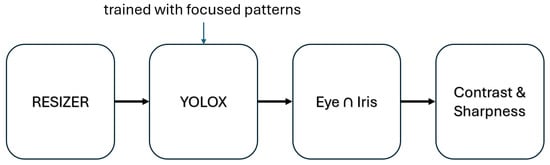 As shown in Figure 7, the flow chart of the detection procedure includes a first preprocessing step, which is carried out by the resizer core on the FPGA that takes the 16MP from the Emerald sensor and transforms it to the required 256 × 256 image. As mentioned above, the YOLOX model detects both eyes and irises/pupils. To improve the rejection of false positives, a post-processing step is added to accept only detections of eyes that, within the bounding boxes, also have iris detection. Finally, although the database includes both in-focus and out-of-focus images and, by not labelling regions with clearly low contrast or sharpness as eyes or irises, YOLOX ensures to some extent that most of the detections are not of low quality, in the iris image stream, many samples may not meet the minimum quality requirements for contrast or sharpness. Taking into account the recommendations of ISO/IEC 29794-6:2015 [] (https://www.iso.org/standard/54066.html (accessed on 17 September 2025)), two tests have been implemented to evaluate contrast and sharpness parameters in all iris images detected.