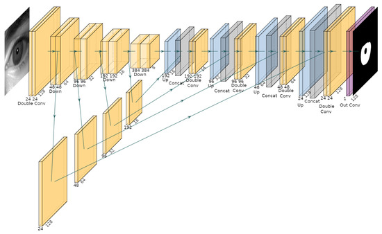 The first preprocessing step consists of resizing the eye crop images from a spatial resolution of 256 × 256 pixels to 128 × 128 pixels. Subsequently, during each downsampling stage of the U-Net encoder, a Double Convolution block is applied, consisting of two consecutive convolutional layers with 3 × 3 kernels and padding of 1, each followed by batch normalisation and a ReLU activation. Each of these blocks is followed by a max pooling operation, which reduces the spatial dimensions by a factor of two. As a result, after each encoder stage, the output feature map has half the height and width of the previous stage and twice the depth. The initial Double Convolution block transforms the input image into a feature map of size 24 × 128 × 128. On the decoder side, each stage employs a 2D transposed convolution operator to upsample the spatial resolution by a factor of two while simultaneously halving the number of feature channels. The resulting upsampled output is concatenated with the feature map of matching spatial dimensions from the corresponding encoder stage via skip connections, and the combined tensor is processed through a Double Convolution block. In this way, the decoder progressively reconstructs the spatial structure of the input while refining high-level semantic information from the compressed feature representations. Figure 8 presents the architecture of the implemented U-Net used for iris segmentation. Finally, the raw segmentation output is post-processed by applying a sigmoid activation function to map the network’s output logits to a [0, 1] probability range. Subsequently, a fixed threshold is applied to obtain the final binary mask, isolating the iris region from non-iris areas within the input image.