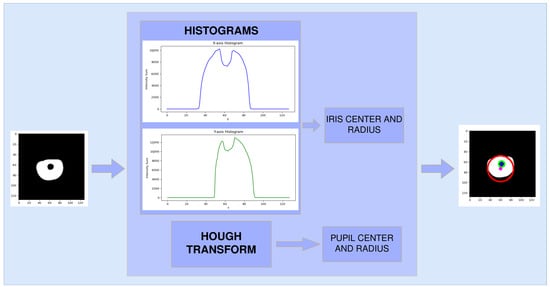 Once the segmentation mask is obtained, one-dimensional histograms along the X and Y axes are computed to analyse the spatial distribution of the segmented iris region. By evaluating the slope of these histograms and applying empirically derived thresholds, the centre coordinates and radius of the iris are estimated. Subsequently, the centre and radius of the pupil are determined using the Hough Circle Transform, which is well-suited for detecting circular structures in binary images. Notably, the Hough Transform was not employed for iris localisation due to the significantly higher computational cost associated with processing a larger area. A diagram of the overall process and its corresponding results are presented in Figure 9.