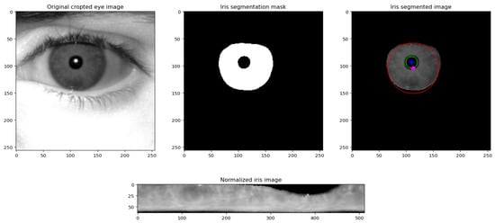 Briefly, biometric identification by iris recognition consists of using the unique pattern of the coloured and textured part of the eye (the iris) as each person’s characteristic “signature” and comparing it with those stored in a dataset to verify and authenticate the identity []. The uniqueness of the iris pattern makes this technique more robust and accurate for verification than other techniques based on different biometric characteristics. Apart from this, other relevant properties of the technique are its stability over time and its relatively easy accessibility. In addition, iris recognition techniques are also interesting in terms of cost. In iris recognition, there are no cards to replace periodically, and no RFID-blocking sleeves to prevent hacking. There is no contact with the camera, neither for registration nor for authentication, so there is no need to replace or clean them. All these features have made iris recognition technology attractive for a wide range of applications, ranging from access control to time management. The increasing adoption of multi-factor authentication services in defence, government organisations, and significantly, healthcare, is aiding the growth of the iris recognition market [].