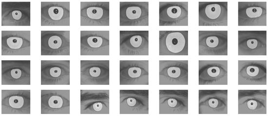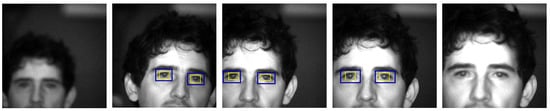 Addressing the detection problem first, Figure 11 shows how the system correctly detects irises in those images that show relatively high contrast and sharpness values. As mentioned above, this is critical, as capturing pass-by sequences of about three seconds, at 47 fps, the set of eye images can exceed 200–250. If all these eyes are passed to the segmentation stage we would need to process a very large number of images in order to discard them. Thanks to the contrast and sharpness tests, the number of images that are passed to the segmentation stage typically does not exceed 10–15 detections.