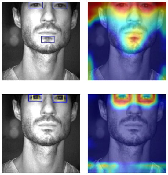 As for false positives, the simple rule applied to YOLOX predictions of only considering valid irises as those within an eye detection has allowed us to observe a qualitative improvement in detection performance. To qualitatively support this empirical hypothesis, we employed the Gradient-weighted Class Activation Mapping (Grad-CAM) technique [,]. Grad-CAM is a method designed to provide visual explanations for decisions made by a wide range of Convolutional Neural Network (CNN)-based models, thereby enhancing model interpretability and transparency. As illustrated in Figure 12, the first row shows the output from a YOLOX model trained exclusively with eye bounding boxes. In this case, the model incorrectly identifies the subject’s chin as an eye, a misclassification clearly highlighted by the corresponding Grad-CAM heatmap, which indicates attention in irrelevant facial regions. In contrast, the bottom row presents the output for the same input image using a YOLOX model trained with both eye and iris bounding boxes. This model correctly detects the eyes, and the Grad-CAM visualisation confirms that its attention is appropriately focused on the ocular region. Both models were evaluated using a confidence threshold of 0.6.