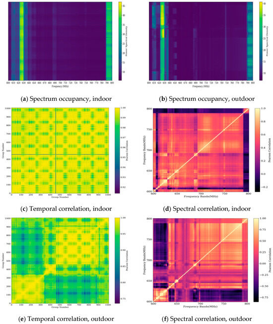 To validate the applicability of prediction methods in practical wireless scenarios, the highly bursty and non-stationary nature of real-world spectrum data must be addressed. Consequently, this study employs authentic spectrum monitoring data collected from physical deployments, as opposed to model-generated datasets that inherently embody mathematical regularity inconsistent with operational complexities. The experimental dataset is sourced from the Electrosense open API, you can acquire it from https://electrosense.org/ (22 January 2024) Comprising aggregated spectral measurements across the 600–800 MHz band. This data was empirically gathered by two heterogeneous sensors (indoor/outdoor) deployed within a 6 km radius of central Madrid, Spain. With 2 MHz resolution bandwidth per spectral channel and 1 min temporal resolution, continuous received signal power measurements were recorded from 1 to 8 June 2021. To assess the viability of deep learning for long-term forecasting, we conduct dependency analysis through Pearson correlation coefficients to quantify linear interdependencies across temporal and spectral dimensions. Specifically, for random variables X and Y, the Pearson correlation coefficient r is defined as: