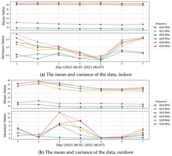 Nevertheless, real-world data exhibit pronounced non-stationarity alongside predictive features. Daily segmentation of 7-day data in the 620–630 MHz band enabled mean and variance calculations. Figure 2 demonstrates measurable fluctuations in these statistics during the observation window. Figure 2b shows marked variance surges during days 2–3 and 5–6, caused by abrupt user population dynamics. Such non-stationary behavior imposes significant challenges for prediction.