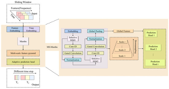 To overcome these limitations, we introduce a novel multi-scale Mamba framework for spectrum prediction. On one hand, it is designed to capture long-term temporal dependencies while integrating fine-grained local features; on the other, it enhances the modeling of spectral variations in the frequency domain. This work represents the first application of the Mamba model to spectrum prediction, fully leveraging its high prediction accuracy and low complexity in time-series analysis. Furthermore, we design a cooperative mechanism between a multi-scale feature pyramid and adaptive prediction heads, thereby strengthening the framework’s capacity to handle non-stationary characteristics and adapt to different forecasting horizons. As a result, our method delivers both high predictive accuracy and computational efficiency under diverse spectral conditions, while maintaining excellent scalability for long-sequence inputs. The key innovations of this work are as follows: