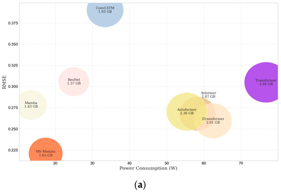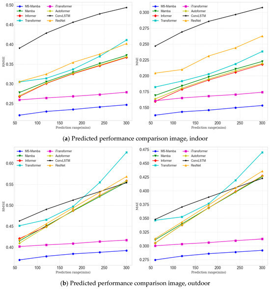 Comparative analysis of Figure 4a,b reveals that most models perform well indoors but exhibit abrupt error surges outdoors. MS-Mamba maintains robust performance due to its integration of state space models (SSMs) for long-term dependencies and dynamic convolution for local feature extraction. This dual mechanism enables comprehensive capture of multi-dimensional spectral correlations across short- and long-term contexts. Concurrently, the multi-scale feature pyramid and adaptive prediction head collaboratively allocate task-specific abstract features for each horizon, enhancing non-stationary feature handling.