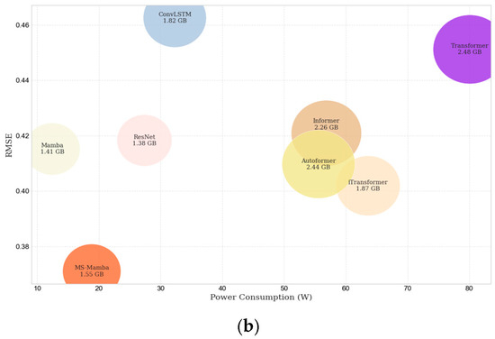 Computational efficiency was evaluated by comparing memory usage and power consumption of MS-Mamba against benchmark models during the training process of spectrum prediction on indoor/outdoor datasets. This assessment verifies whether optimal efficiency accompanies high prediction accuracy when processing complex data. To ensure fairness, each model underwent isolated GPU training to prevent cross-model interference, with all measurements meticulously recorded. Comparative computational efficiency is visualized via bubble plots in Figure 5, where axes represent memory footprint (GB) and energy consumption (Watt).