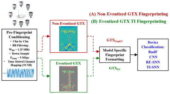The device collections in [10,11] were adopted in [1] to introduce the development of an RF eventization approach to RFF and to demonstrate the potential for the envisioned ‘RF Event Radio’. RF eventization effectively reduces the computational complexity of resultant fingerprints by forming event-based matrix representations of the RF signal, rather than using statistical fingerprint feature representations. These event-based fingerprints are compatible with both traditional classifiers (e.g., RndF and CNN) as well as emerging neuromorphic-friendly classifiers supporting low-energy neuromorphic processing objectives. This step marked the transition from conventional statistical features toward event-based fingerprints that reduce complexity while aligning with neuromorphic processing goals of the ‘RF Event Radio’.