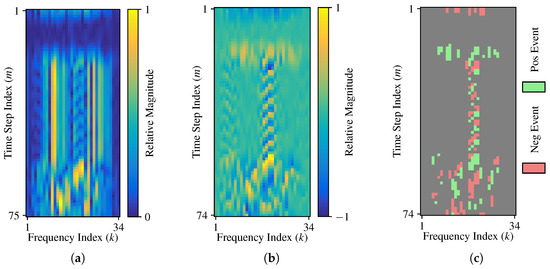 where is the signum function, with = 0 by definition. The sign of provides an indication of event presence and polarity at a given time step and frequency bin pair. This includes indicating a negative event, indicating a positive event, and indicating no event was detected.