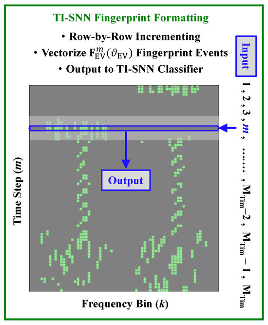 While the TI-SNN preprocessing requirements are greatly reduced from the spike rate-encoding method used in [15], there remains two issues that had to be addressed to enable the TI-SNN classifier to process eventized fingerprints generated per (5) and depicted in Figure 2c. First, Pytorch does allow for negative spikes in SNN processing, but most neuromorphic hardware architectures only process positive spikes—only positive spikes are input to the TI-SNN classifier and exploiting negative spike information in Figure 2c is desired. Second, by design, the TI-SNN only processes a single row of frequency elements in during the mth timestep—all time steps need to be processed. To address these issues, the ()-dimensional eventized matrices such as depicted in Figure 2c are converted using the following steps: