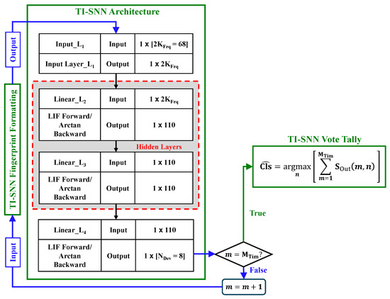 As the TI-SNN processes each of the fingerprint matrix time increments () according to the layers listed in Table 3, a sequence of output spikes is produced at the layer output for each class (device) (). The final class inference (estimate) is determined by the output neuron having the highest spike count once all of the time increments have been processed. This vote-tallied inference is made using