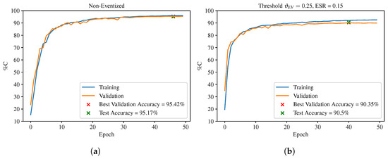 Training curves for the TI-SNN classifier using (a) non-eventized fingerprints and (b) eventized fingerprints for .